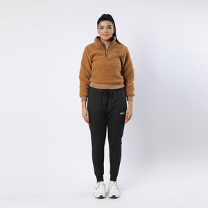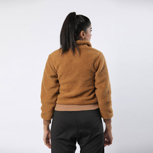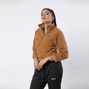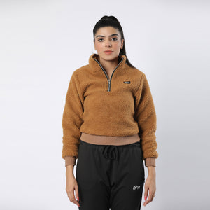 A cozy half-zip sweater made from a soft teddy material. Designed with dropped shoulders and a loose fit, which makes it ideal for layering when worn outdoors. It comes with ribbed cuffs and hem as well. -